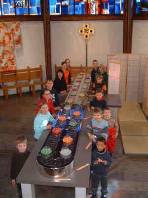 Im Mittelpunkt der Dekoration stand das Fließband einer Würzburger Sushibar, das mit dem Altar die Form eines Kreuzes ergab und zugleich den Chorraum mit der Gemeinde verband. Auf dem Sushiband, das von Kindern mit Stäbchen umrahmt war, drehten sich bunte Teller mit durchsichtigen Hauben. Dazu habe ich den Kindern und der Gemeinde erklärt: Wir Christen empfangen alles, was wir zum Leben brauchen, vom Tisch des Herrn. Und wenn wir das, was wir empfangen haben, mit anderen teilen, wird es nicht weniger, sondern mehr. Der Tisch des Herrn ist weit ausziehbar. So weit, dass Menschen aus allen Zeiten und Ländern daran Platz finden. An diesem Tisch sitzen auch Deutsche und Japaner: Menschen, für die das "täglich Brot" der Inbegriff der Ernährung ist. Und andere, die im Vaterunser um den "täglich Reis" bitten, weil sie kein Wort für Brot haben. Auf diesem Tisch dreht sich ein Band, das keinen Anfang und kein Ende hat. Dieses Band ist für mich ein Bild für die Liebe Gottes, die schon der Liederdichter Paul Gerhardt besungen hat: "Weil denn weder Ziel noch Ende / sich in Gottes Liebe find't, / ei so heb ich meine Hände, / zu dir, Vater, als dein Kind, / bitte, wollst mir Gnade geben, / dich aus aller meiner Macht / zu umfangen Tag und Nacht / hier in meinem ganzen Leben, / bis ich dich nach dieser Zeit / lob und lieb in Ewigkeit".